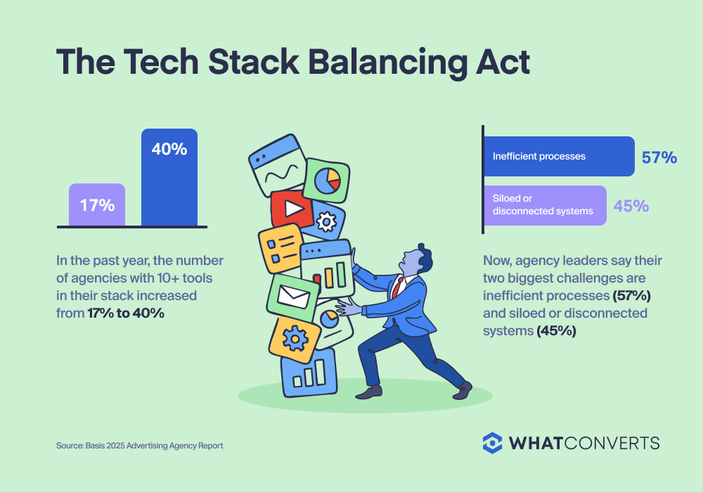 This is a story that’s playing out across the industry: according to the Basis 2025 Advertising Agency Report, the number of agencies juggling 10+ tools jumped 131% over just 12 months.