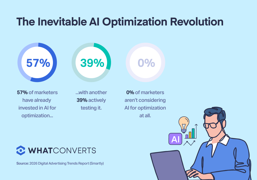 According to Smartly’s 2026 Digital Advertising Trends report, 57% of marketers have already invested in AI for optimization, with another 39% actively testing it.