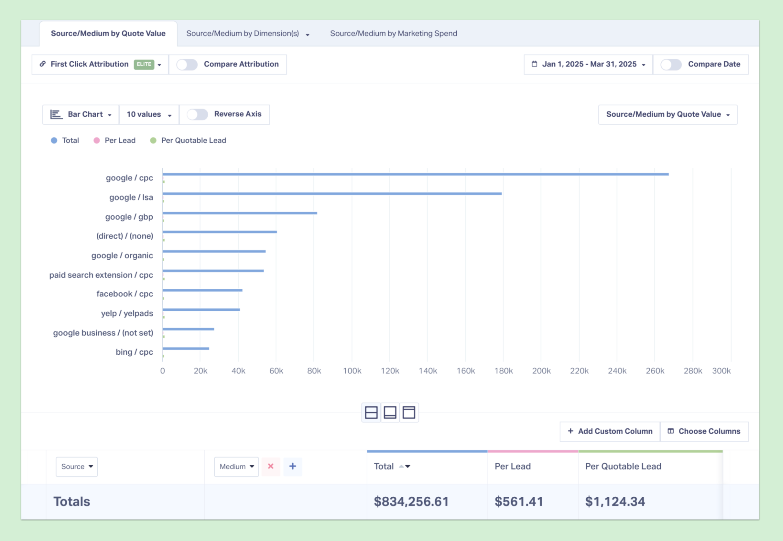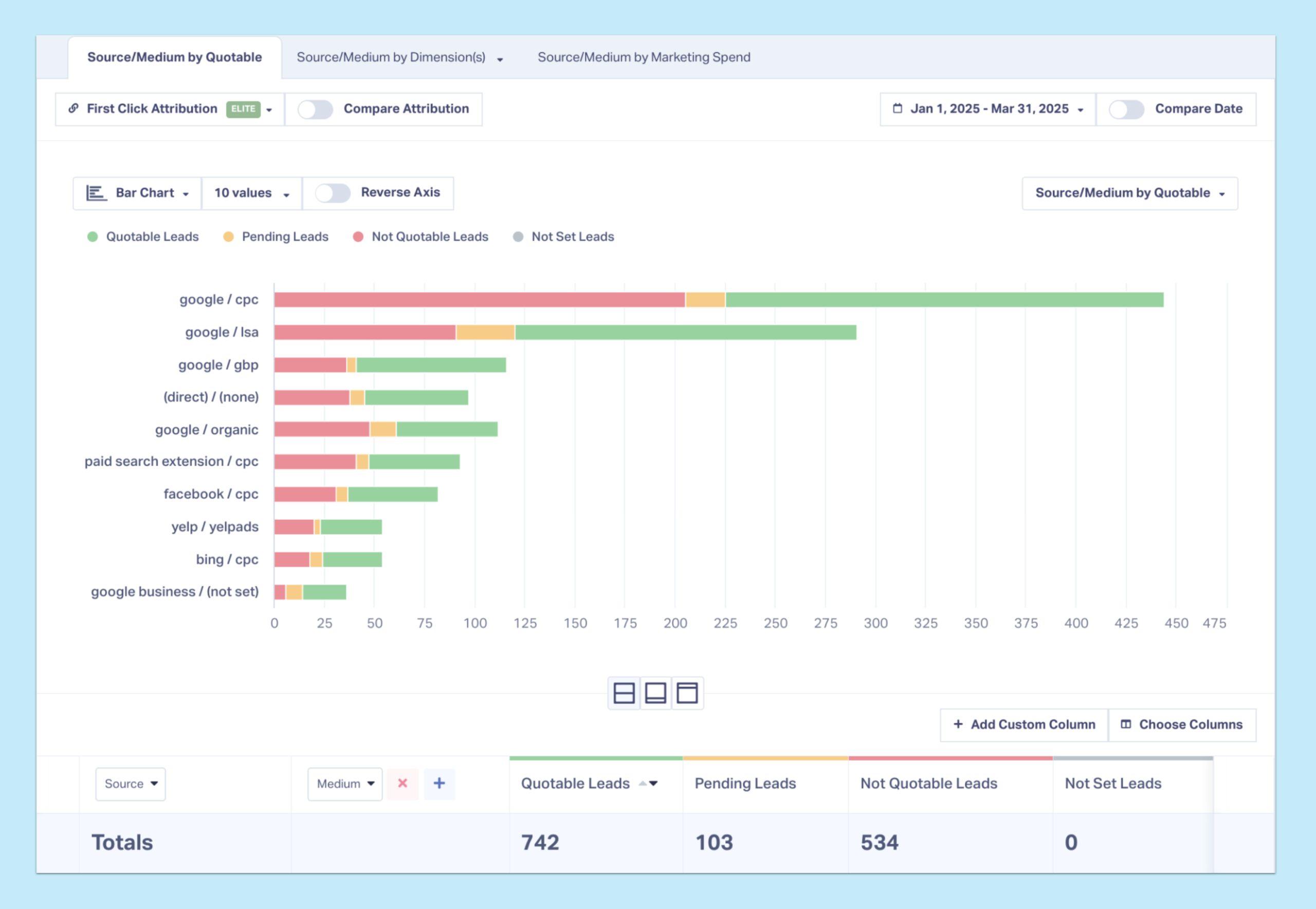 First, we’ll generate a “Quotable Leads by Source/Medium” report that shows exactly how many leads came from each of our efforts. We can also do this by keyword, campaign, channel, and so on.