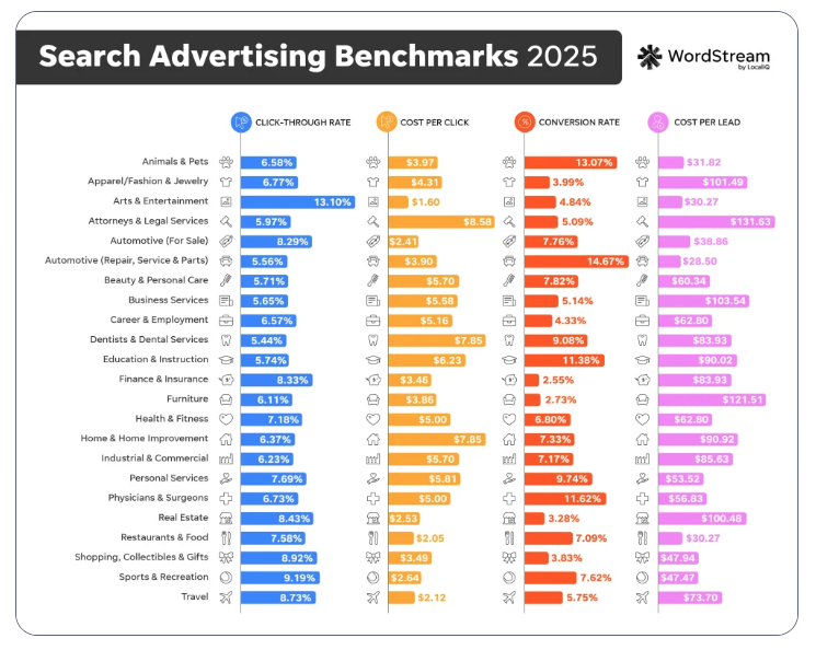The average cost per click in Google Ads hit $5.26 in 2025—12.88% higher than last year. The three most expensive industries? Attorneys ($8.58 per click), dentists and home improvement companies (both $7.85). These high-stakes service industries face the steepest costs and the thinnest margins for error.