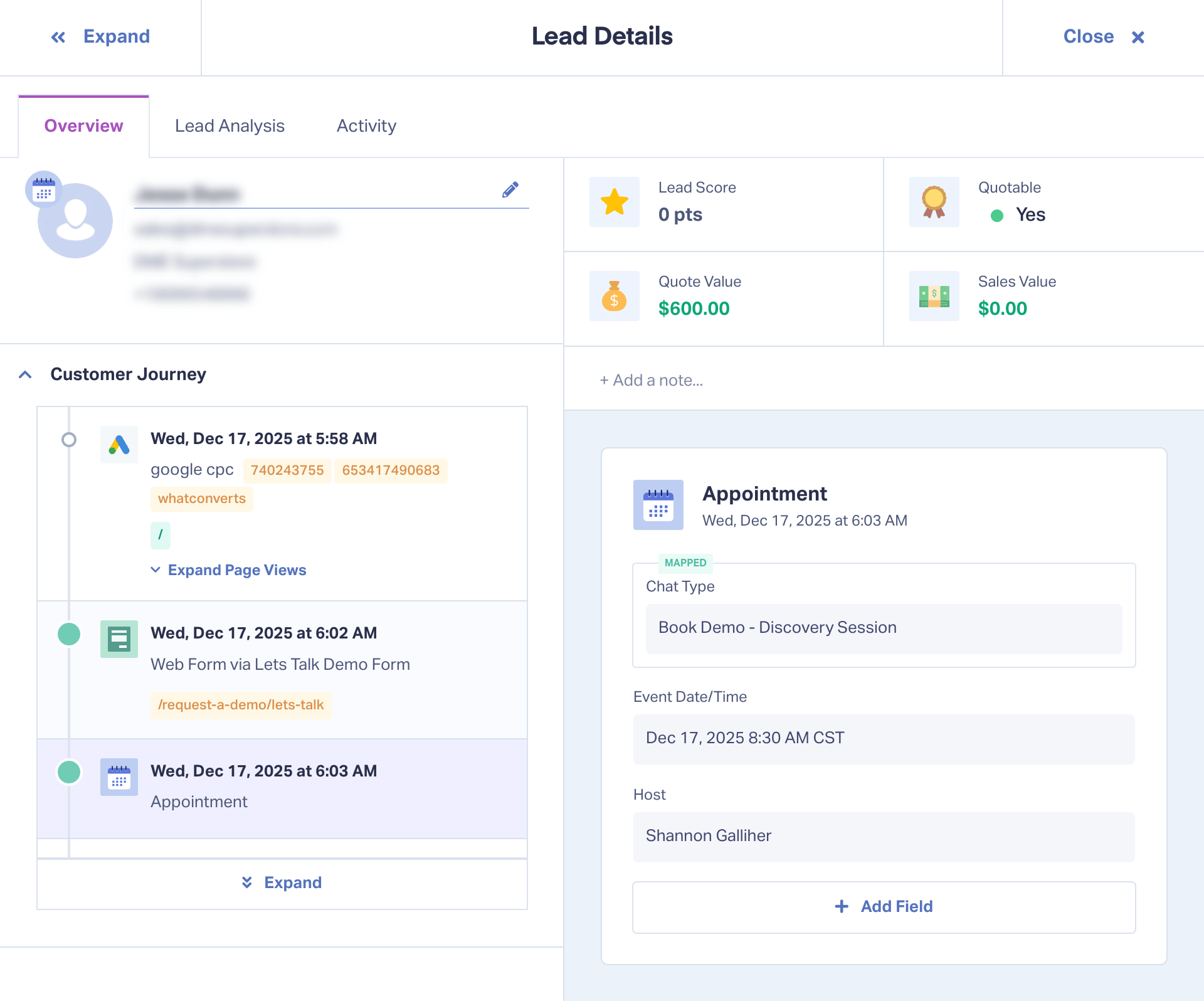 Here's how your Appointments show up in the Lead Details screen of WhatConverts, including form info, attribution, and other helpful lead details.