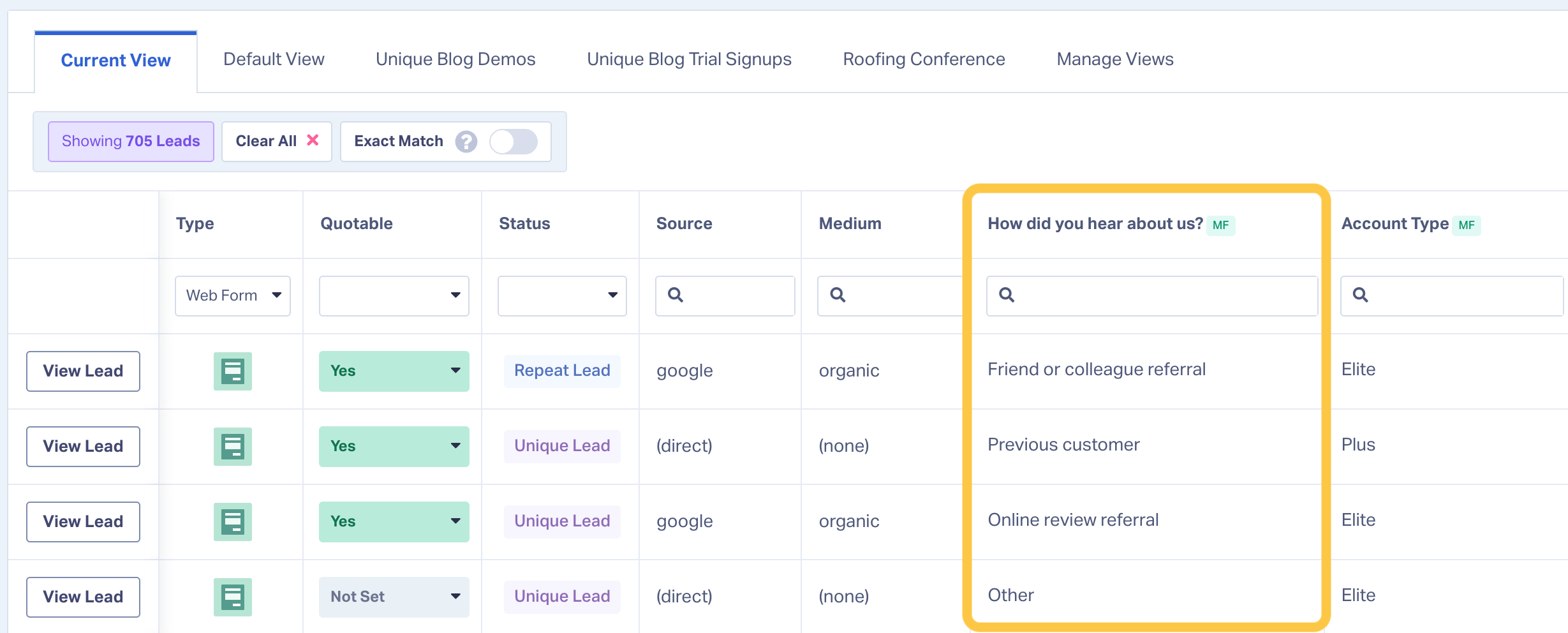 Here’s what that looks like in the Lead Manager. Best of all, you can sort and filter your leads by this field just like any other data point.