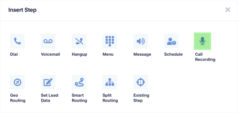 A Call Recording Step enables or disables call recording at specific points in your Call Flow. You can control when recording starts or stops, play optional recording notification messages to callers, and ensure compliance with call recording laws.