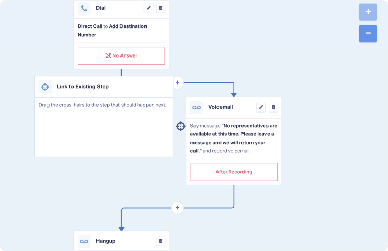 - Creating loops or repeated actions: Connect back to an earlier step to repeat part of the Call Flow (e.g., return to a menu after an invalid selection).