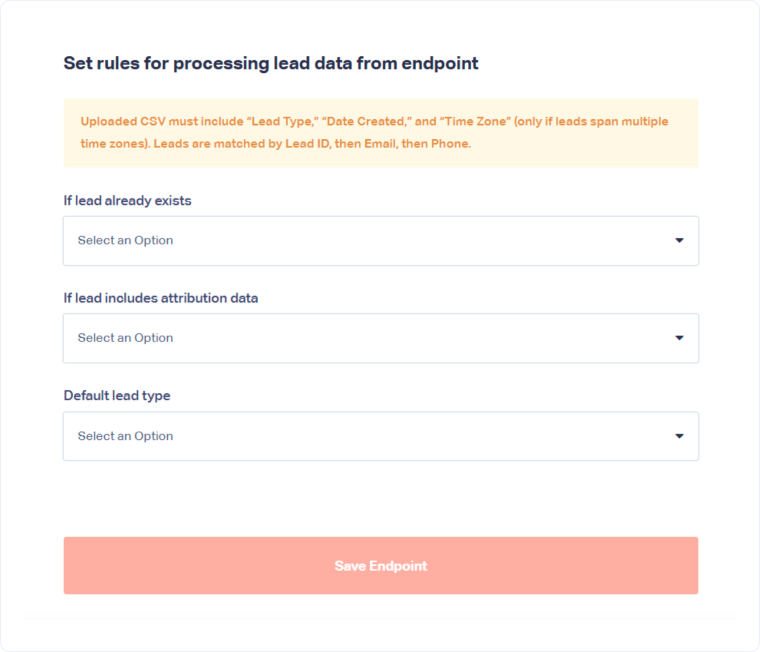 - For flexible imports: Use "Update existing lead with endpoint data" to update matches and create new leads when no match is found