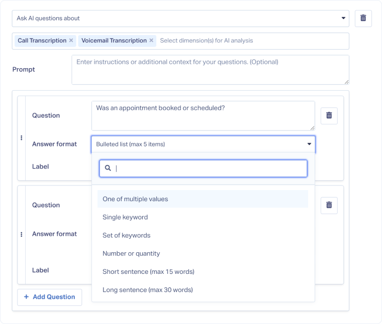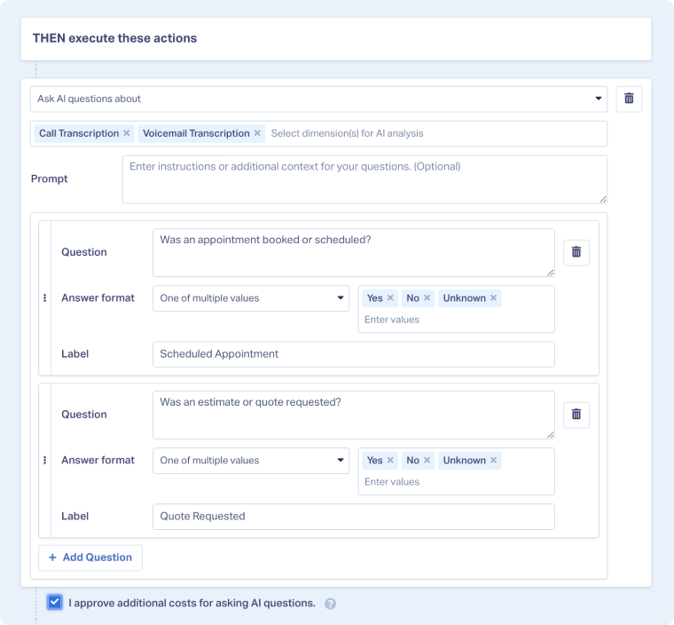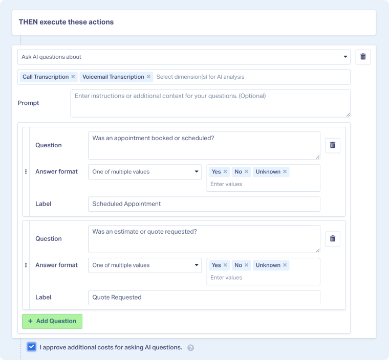 Ask AI Lead Intelligence rules let you automatically extract custom insights from call transcripts, form messages, and chat conversations by asking specific questions that AI answers for every lead. These rules automatically extract the exact information your business needs from your leads.
