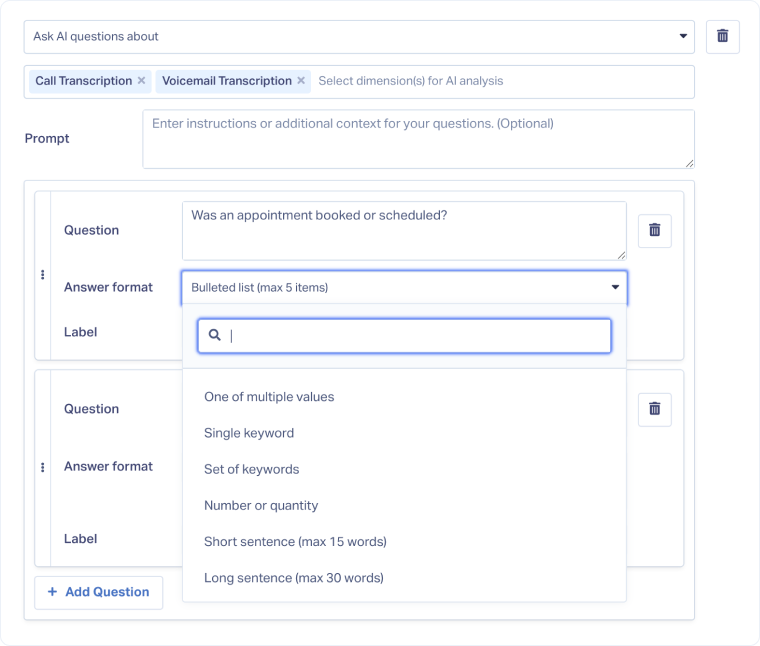 - Dimensions to analyze: Which fields AI should read (Call Transcription, Voicemail Transcription, Form Message, etc.)