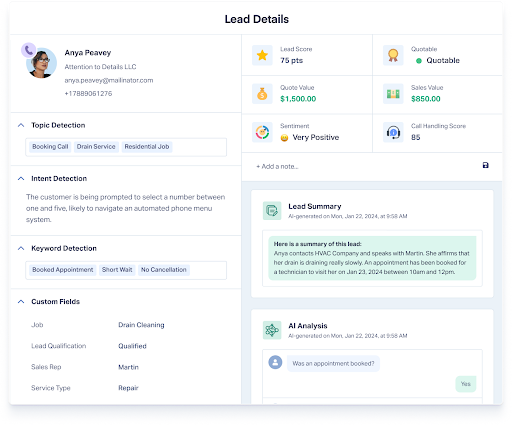 - Sales teams: Gain visibility into how calls are handled, identify missed opportunities, and hold reps accountable. Lead Intelligence ensures fewer valuable leads are lost to poor follow-up and more convert into revenue.