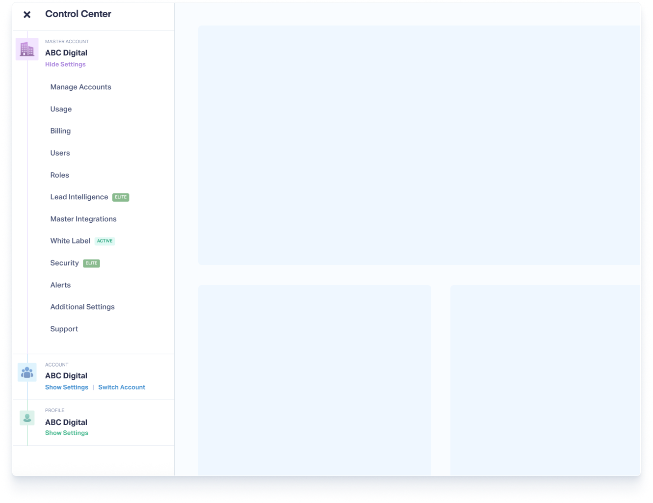 - Master Account Settings: Access global admin tools like Billing, Users, Roles, Master Integrations, and White Label.
