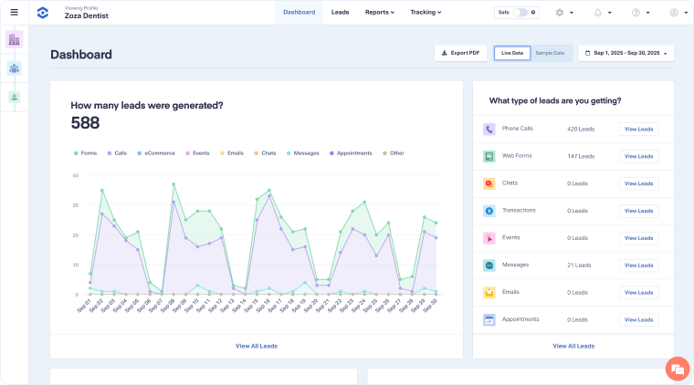 - What type of leads are you getting?: View the distribution of leads by type, such as phone calls, forms, or appointments. This shows which channels are driving conversions and whether your marketing mix is balanced across lead sources.