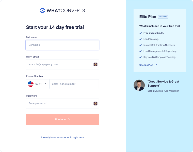 You can open your WhatConverts account and start your 14-day free trial in just a few minutes. Learn all the advantages of the free trial here.