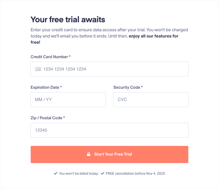 To activate your free trial, enter your payment information. You won’t be charged today. This ensures uninterrupted access if you choose to continue after the trial.