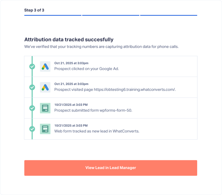 - Once processed, you’ll see confirmation that attribution data was captured (e.g., “Ad clicked → Website visit → Form submitted → Form tracked in WhatConverts.”)