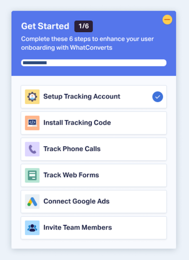 The Get Started Checklist makes setting up WhatConverts simple and fast. In just a few minutes, you’ll complete six key steps that ensure every lead is tracked correctly. Any steps you finished during account setup will be checked off automatically, so you only focus on what’s left.