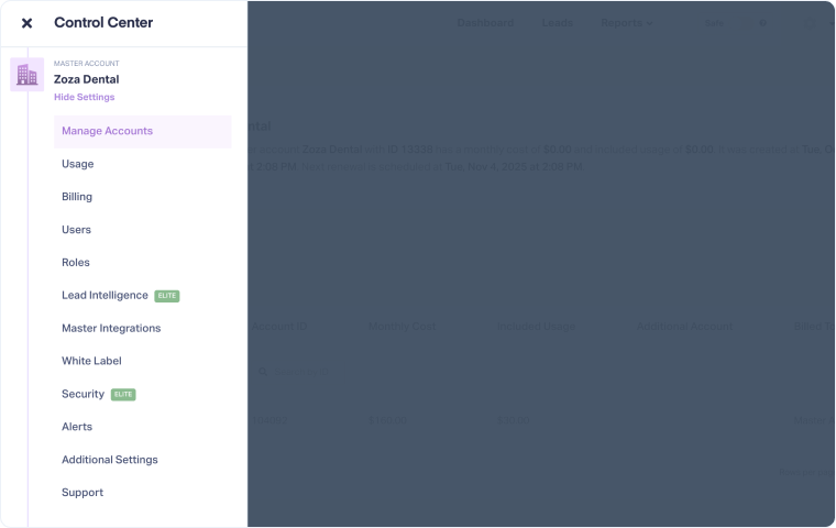 By centralizing structure and administration, the Control Center keeps every client or profile organized, ensures leads are captured consistently, and makes account management simple even as you scale.