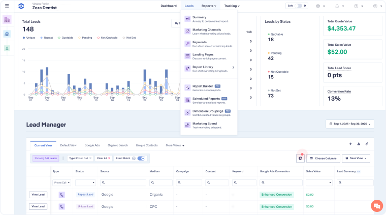 - Dashboard: Get a real-time overview of performance, including total leads, quote and sales value, conversion rates, and which sources, mediums, and pages drive the most leads.