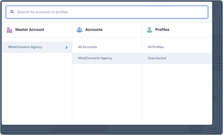 WhatConverts is designed so you can move easily between admin tasks and the day-to-day work. The platform is organized into three main navigation areas: the Control Center for account setup and administration, the Account Navigator for moving between accounts and profiles, and the Workspace where you track leads, build reports, and prove ROI.