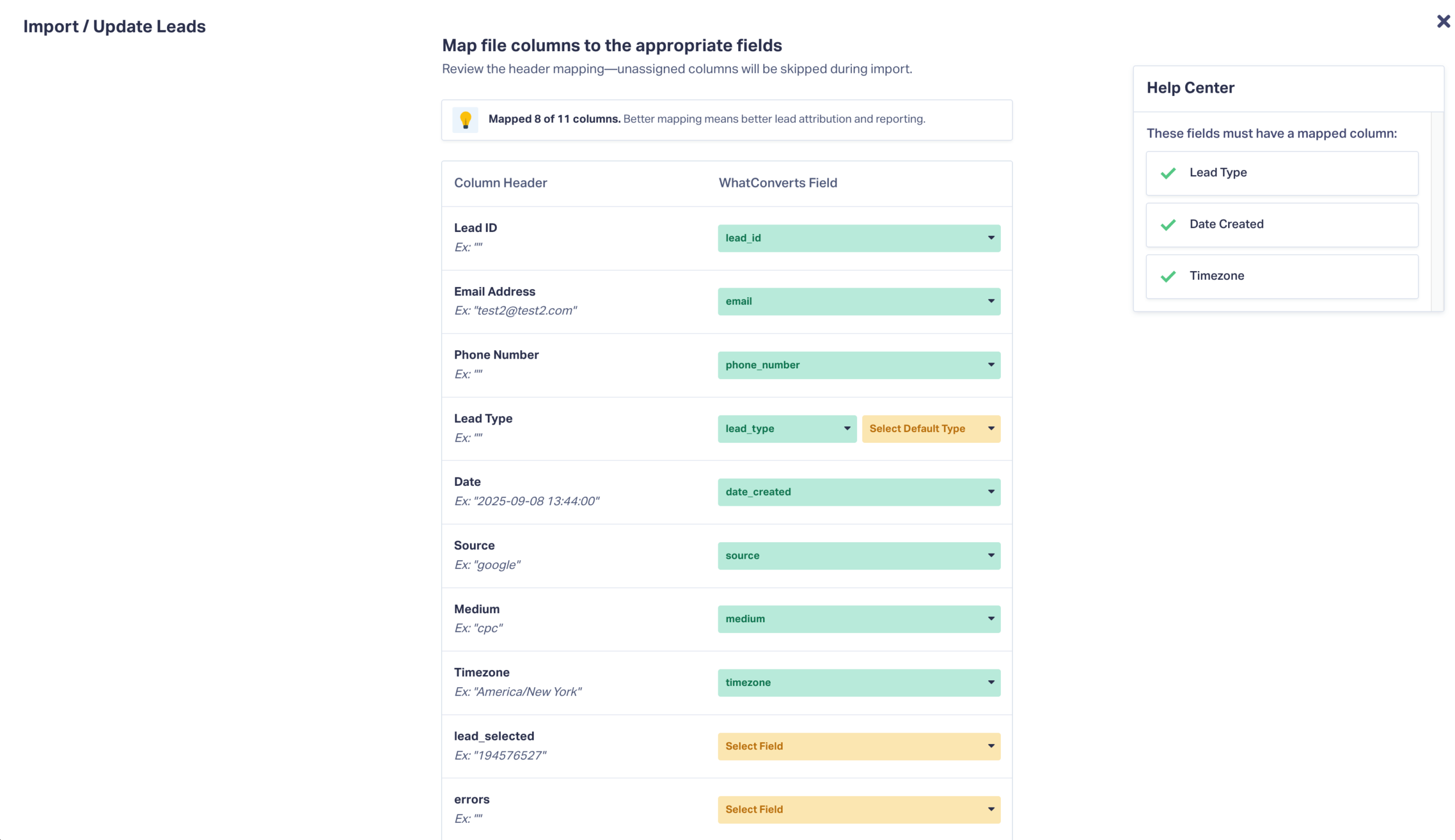 - Required fields: Lead Type, Date Created, and Timezone must be mapped before you can continue