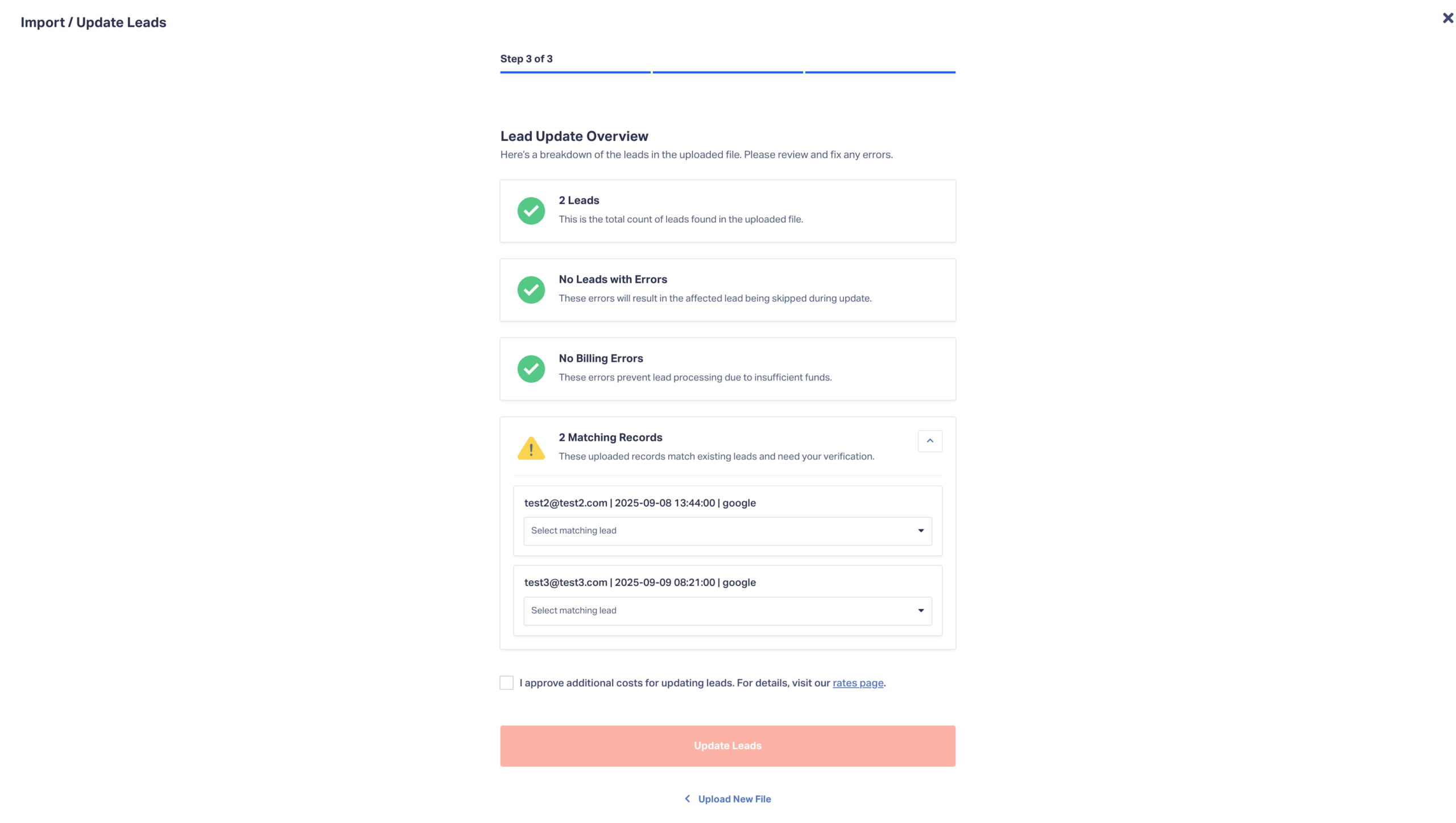 The import/update process follows the same 3-step workflow regardless of which option you choose, but the steps vary based on whether you're importing new leads or updating existing ones.