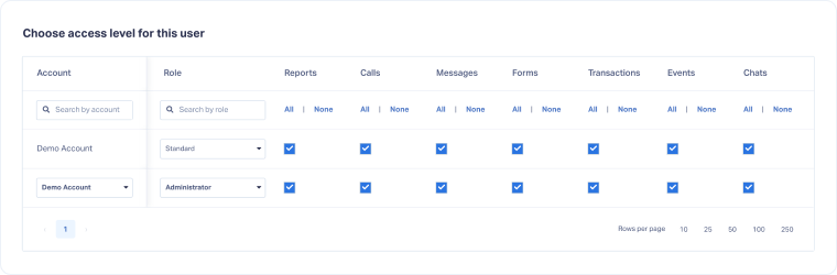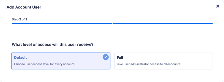 Note: Selecting the Full level of access will grant the user Administrator access to all accounts within that Master Account.