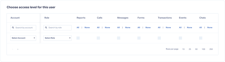 - Select the "Default" level of access to control which accounts and roles the user will have access to.