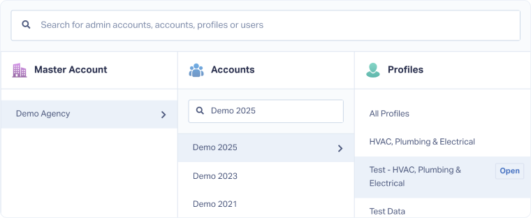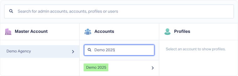 The Account Navigator lets you quickly move between Master Accounts, Accounts, and Profiles. You can search by name, ID, or email, or use the visual menu to switch levels.