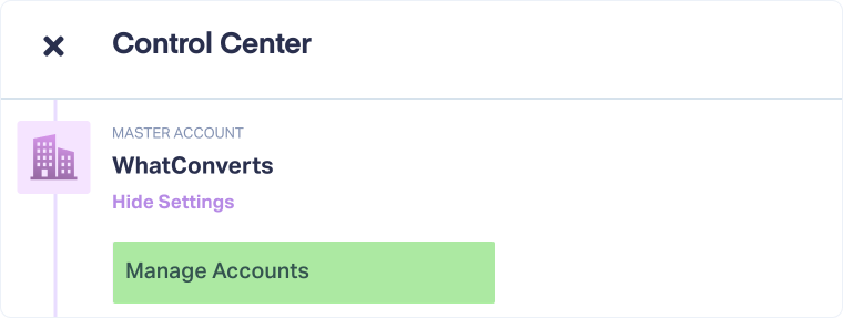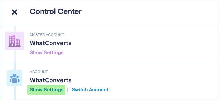 To access Account-level settings, you need to be at least at the Account level. If you're only viewing the Master Account, you'll only see Master-level settings in the Control Center.