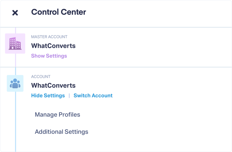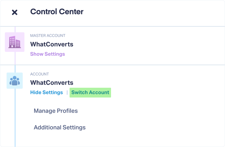 An Account represents one business or client and connects your Master Account to the Profiles under it