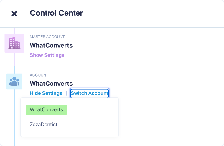 If you have access to multiple Accounts under the same Master Account, quickly move between them from the Control Center: