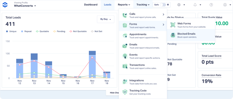Blocking email addresses prevents unwanted or spam submissions from being recorded in WhatConverts. You can block emails at either the Master Account or Profile level.