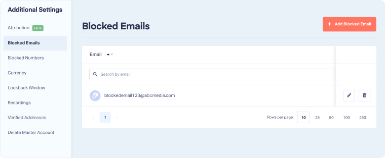 - Select the orange "Add Blocked Email" button to add new lines for each address you'd like to block.