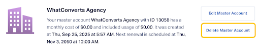 If you are using an Agency plan and decide to stop using WhatConverts, you have two options for how to move forward. You can fully cancel your Master Account, which permanently deletes all profiles and data associated with it.