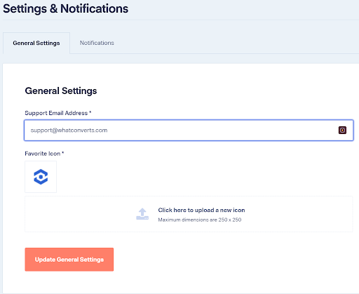 - Under General Settings, add your Support Email Address and upload a Favorite Icon (favicon) to display in the browser tab.
