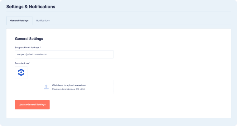 Once your White Label domain is connected, you can customize how your platform looks and communicates with clients. White Label settings let you add your branding, update support details, and tailor notifications so clients see WhatConverts as an extension of your business.