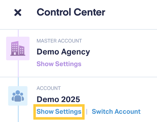To access Account-level settings, you need to be at least at the Account level. If you're only viewing the Master Account, you'll only see Master-level settings in the Control Center.