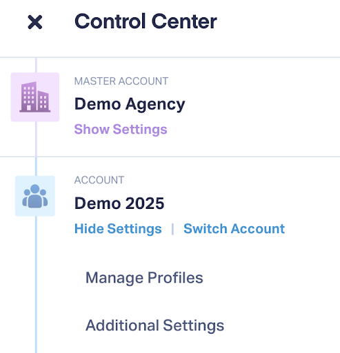 An Account represents one business or client and connects your Master Account to the Profiles under it