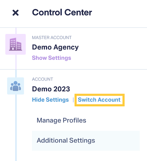 If you have access to multiple Accounts under the same Master Account, quickly move between them from the Control Center: