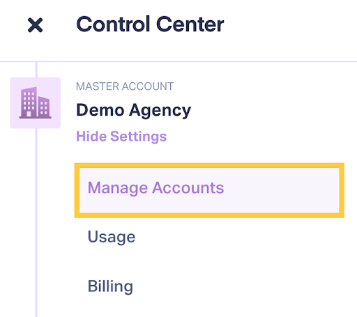 - Click "Manage Accounts" from the Master Account Settings menu.