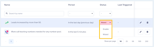 - Use the Status column to enable or mute an Alert.
