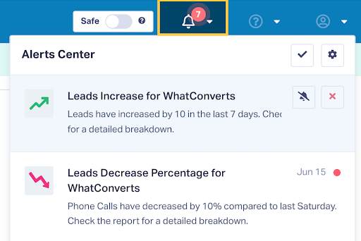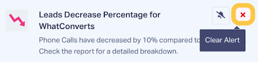 Once you've set up Lead Volume Change Alerts or Tracking Number Capacity Alerts, the Alerts Center is where you can review and manage every triggered alert. From the Alerts Center, you can quickly investigate, clear, or mute alerts so your team stays focused on what matters most.