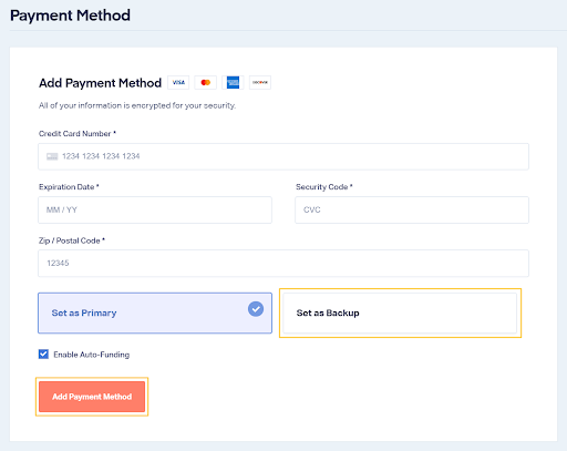 Setting a Backup Payment Method ensures your monthly renewal and usage fees are covered if your Primary Payment Method fails.