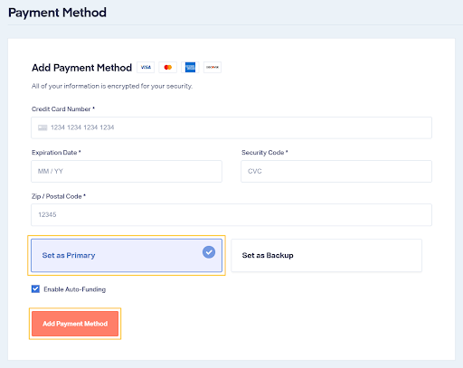 Setting a Primary Payment Method ensures your monthly renewal and usage fees are covered.