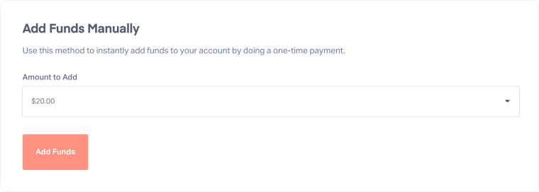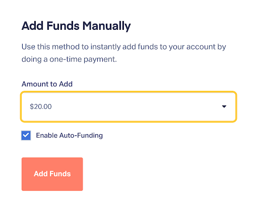 - Under the Add Funds Manually tab, select the amount of funds you would like to add.