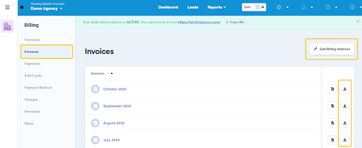 Master Account Users can view and download invoices directly from the Billing section in WhatConverts. This feature allows you to review monthly billing statements, download PDFs, and update your billing address information.