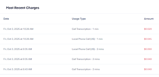 The Most Recent Charges section shows you the recent charges in your Master Account, including those from leads, tracking numbers, and other services.