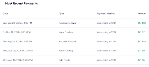 The Most Recent Payments section shows you the recent payments in your Master Account, including payments for account renewals, manually added funds, and auto funding.