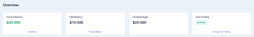 The Billing Overview page displays your account's balance, plan, recent charges, and recent payments. This is the first place to check when you want to understand your billing activity at a glance.