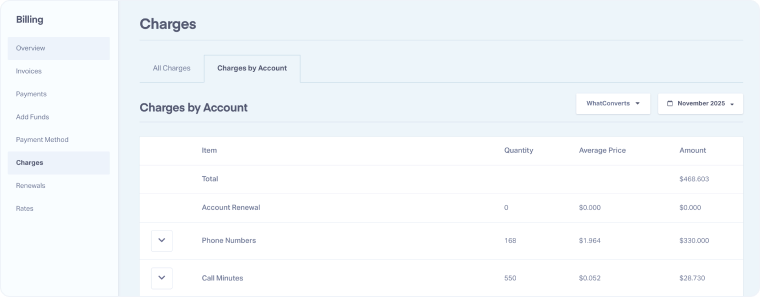 Viewing Charges by Account lets you select specific accounts to view their charges. This includes charges from leads, tracking numbers, and other services.