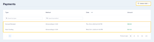 The Payments page lists the payments made on your account each month. This includes payments for account renewals, manually added funds, and auto funding. Reviewing your payment history helps you confirm successful transactions.