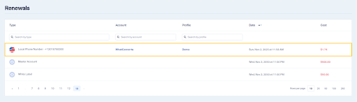 The Renewals page lists items that renew in your account each month, such as your plan, tracking numbers, and white label.